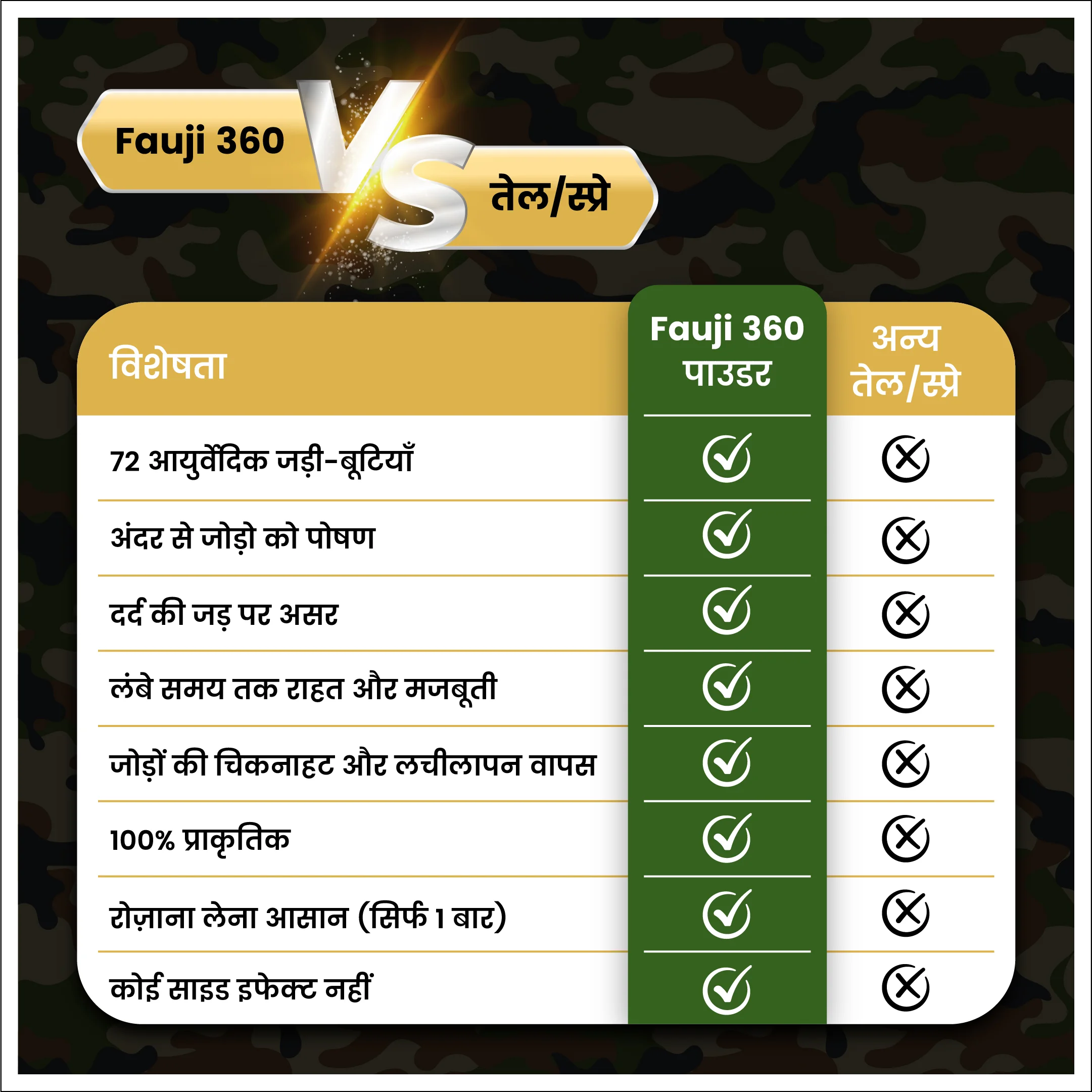 Fauji 360 शरीर में जाकर खून के संचार को बेहतर बनाता है, जिससे जोड़ों की सूजन और दर्द धीरे-धीरे कम होते हैं। इसमें मौजूद 72 प्राकृतिक जड़ी-बूटियाँ हड्डियों और मांसपेशियों को गहराई से पोषण और मजबूती देती हैं। यह सिर्फ अस्थायी राहत नहीं देता, बल्कि दर्द की जड़ तक पहुंचकर उसे खत्म करता है और शरीर को फिर से लचीला, मजबूत और सक्रिय बनाता है।